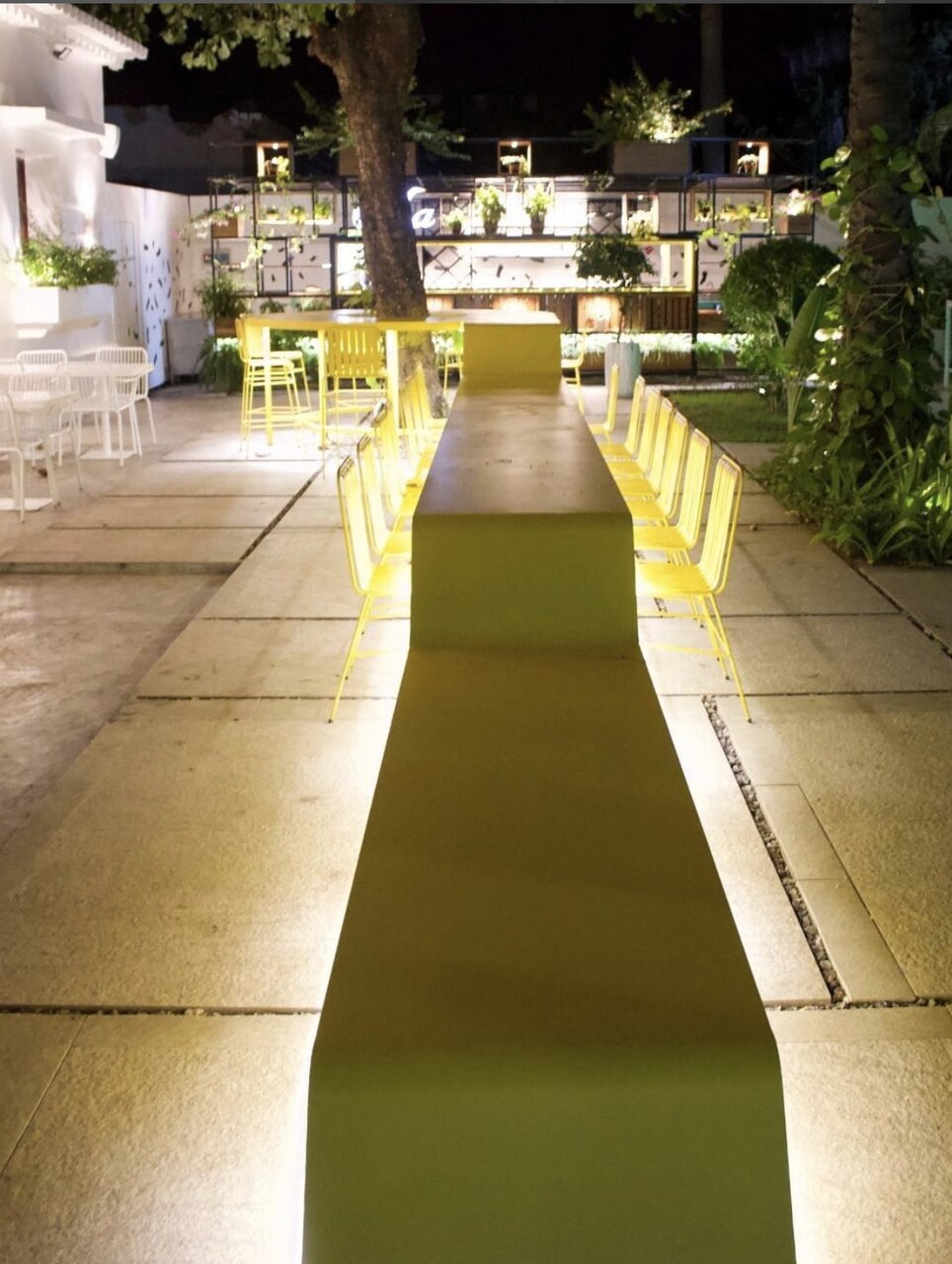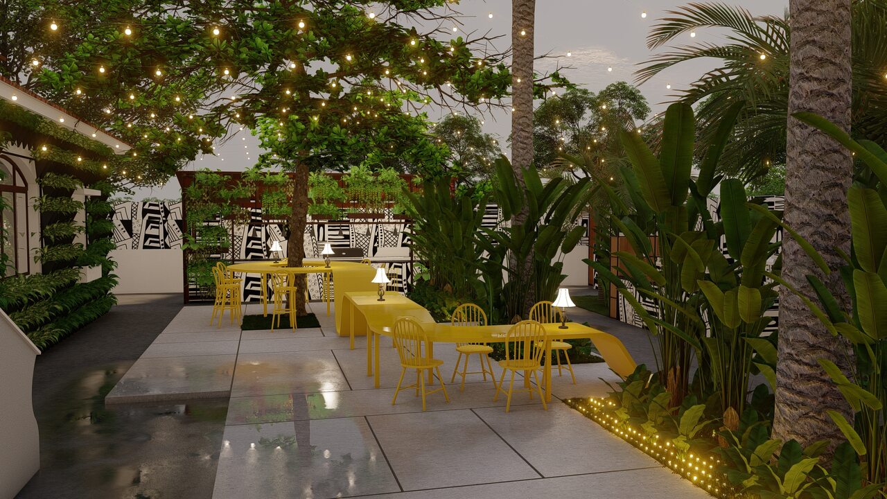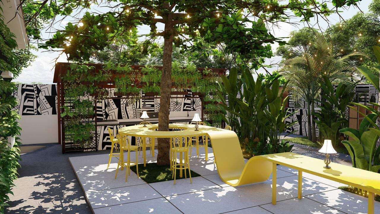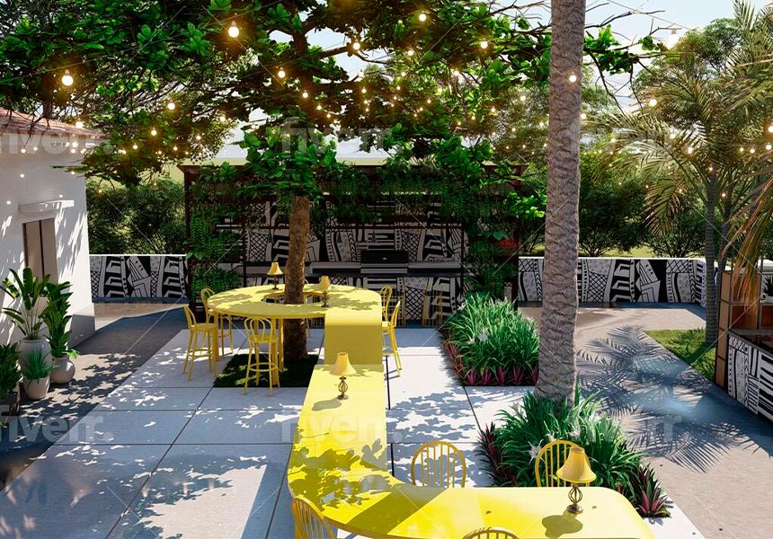 O bar e a mesa foram projetados especificamente para atender às necessidades do espaço, garantindo funcionalidade e estilo. A iluminação foi cuidadosamente escolhida para criar diferentes atmosferas, desde as luzes que emolduram a árvore central até as fairy lights que iluminam a área destinada ao cinema ao ar livre.