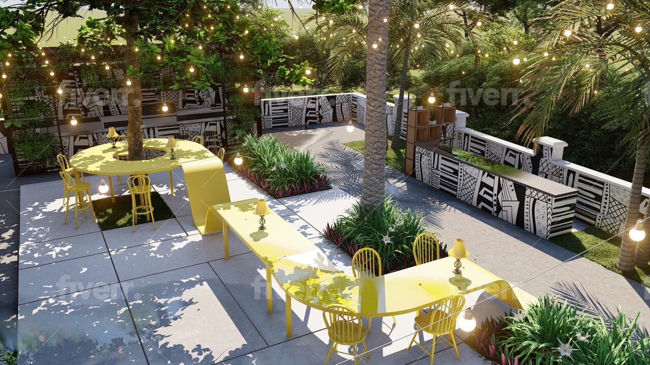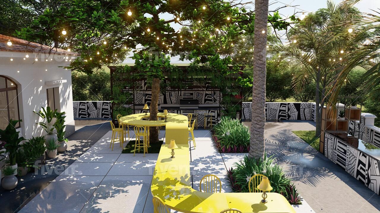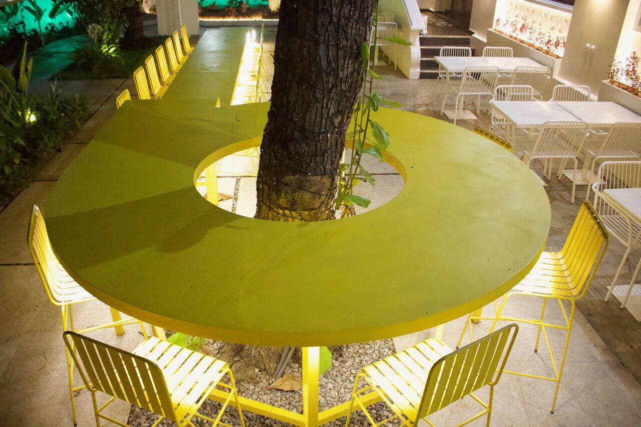 O bar e a mesa foram projetados especificamente para atender às necessidades do espaço, garantindo funcionalidade e estilo. A iluminação foi cuidadosamente escolhida para criar diferentes atmosferas, desde as luzes que emolduram a árvore central até as fairy lights que iluminam a área destinada ao cinema ao ar livre.