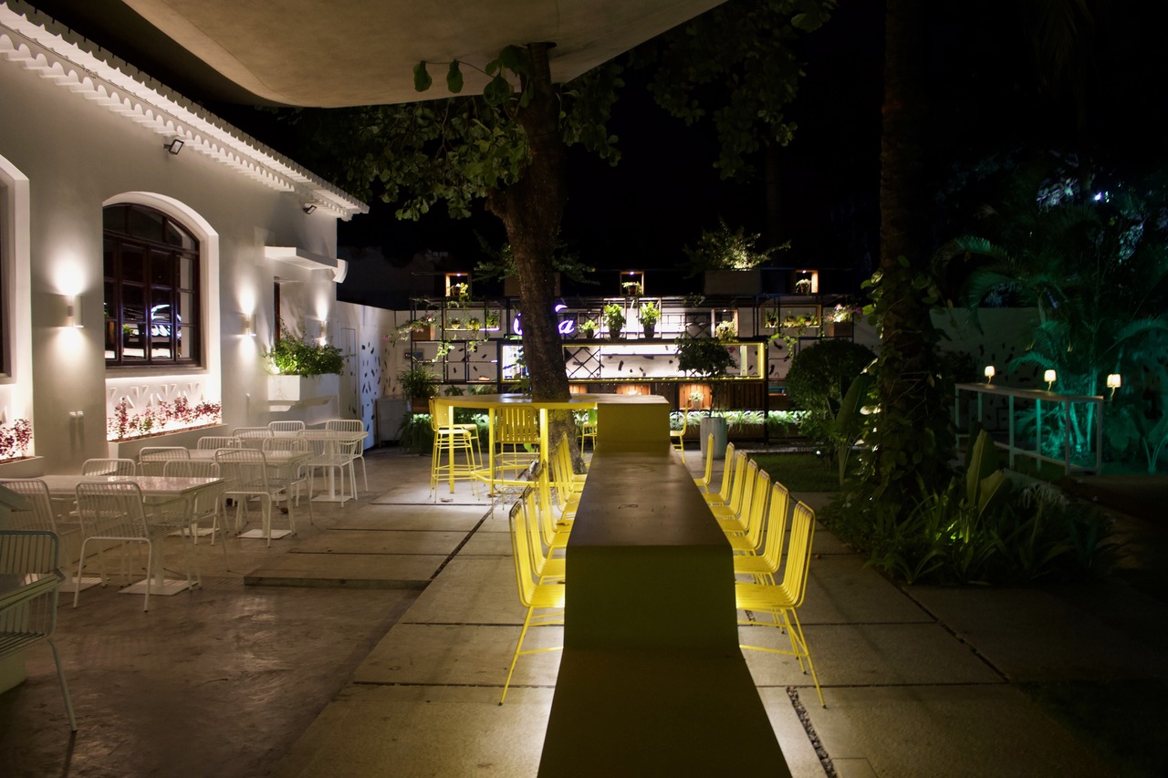Para o projeto VĒRD, transformamos o exterior de uma moradia colonial em um espaço vibrante dedicado à arte, música e gastronomia, com uma estética moderna, informal e sofisticada. A intervenção aproveitou o jardim frontal da residência, criando um salão de refeições ao ar livre, uma área de bar e um espaço de convívio, todos cercados pela beleza natural do jardim existente.